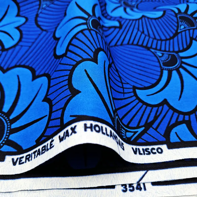 This veritable Holland wax cloth showcases a vibrant blue wax print crafted using traditional Dutch Wax techniques, creating double-sided, colorfast designs ideal for dresses, skirts, shirts, and African attire.